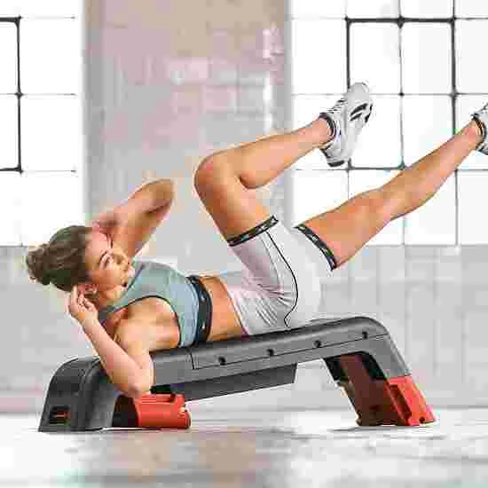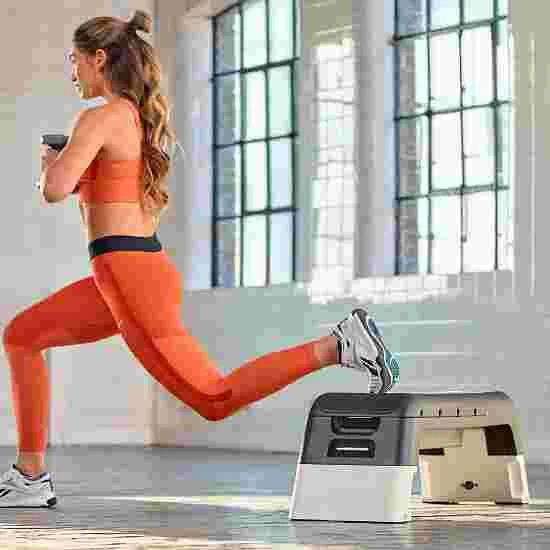 Step and workout bench in one. Two levels of height adjustment (20 and 35 cm) and four different backrest positions (flat bench, incline bench and seat). Internal storage compartment for small fitness products. Comes fully assembled. Easy to clean, moisture-resistant and hard-wearing. 70% PP, 11.5% TPR, 10% iron, 7% nylon and 1.5% ABS. LxWxH: 121.5×33.7×35 cm. 12.4 kg. Max. load: 150 kg.